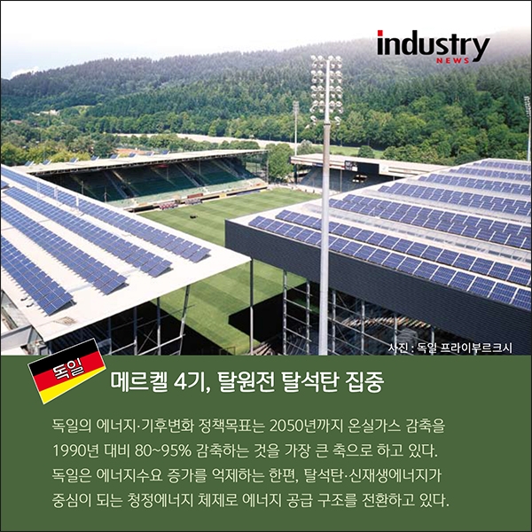 독일 메르켈 정부는 탈원전, 탈석탄에 집중하고 있다. 독일의 에너지‧기후변화 정책목표는 2050년까지 온실가스 감축을 1990년 대비 80~95% 감축하는 것을 가장 큰 축으로 하고 있다. 독일은 에너지수요 증가를 억제하는 한편, 탈석탄‧신재생에너지가 중심이 되는 청정에너지 체제로 에너지 공급 구조를 전환하고 있다.