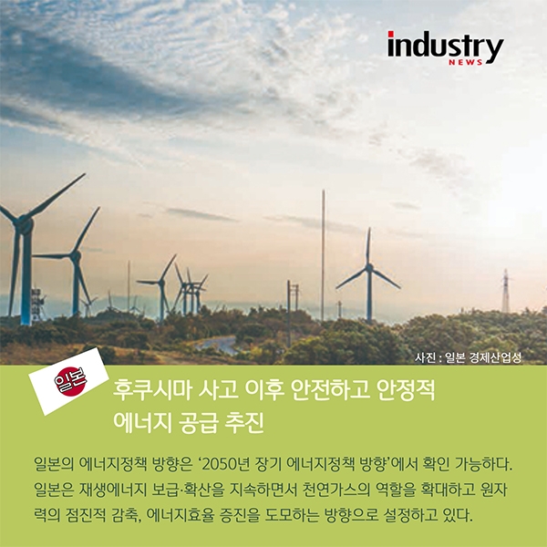 일본은 후쿠시마 사고 이후 안전하고 안정적 에너지 공급을 추진하고 있다. 일본의 에너지정책 방향은 ‘2050년 장기 에너지정책 방향’에서 확인 가능하다. 일본은 재생에너지 보급‧확산을 지속하면서 천연가스의 역할을 확대하고 원자력의 점진적 감축, 에너지효율 증진을 도모하는 방향으로 설정하고 있다.