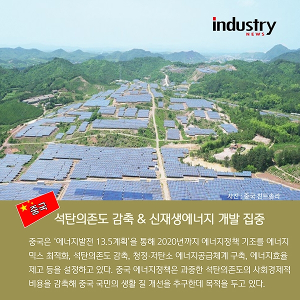 중국은 석탄의존도 감축과 신재생에너지 개발에 집중하고 있다. 중국은 ‘에너지발전 13.5계획’을 통해 2020년까지 에너지정책 기조를 에너지믹스 최적화, 석탄의존도 감축, 청정‧저탄소 에너지공급체계 구축, 에너지효율 제고 등을 설정하고 있다. 중국 에너지정책은 과중한 석탄의존도의 사회경제적 비용을 감축해 중국 국민의 생활 질 개선을 추구하는데 목적을 두고 있다.