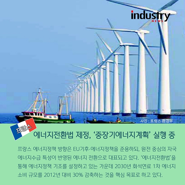 프랑스는 에너지전환법 제정·공포하고, ‘중장기에너지계획’을 실행하고 있다. 프랑스 에너지정책 방향은 EU기후‧에너지정책을 준용하되, 원전 중심의 자국 에너지수급 특성이 반영된 에너지 전환으로 대표되고 있다. ‘에너지전환법’을 통해 에너지정책 기조를 설정하고 있는 가운데 2030년 화석연료 1차 에너지 소비 규모를 2012년 대비 30% 감축하는 것을 핵심 목표로 하고 있다.