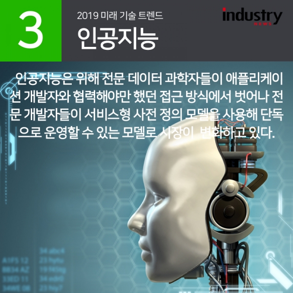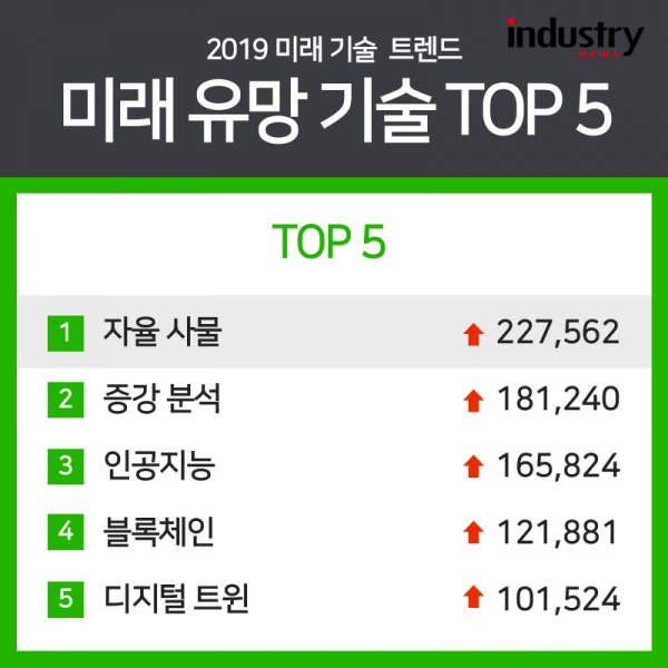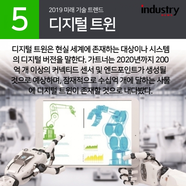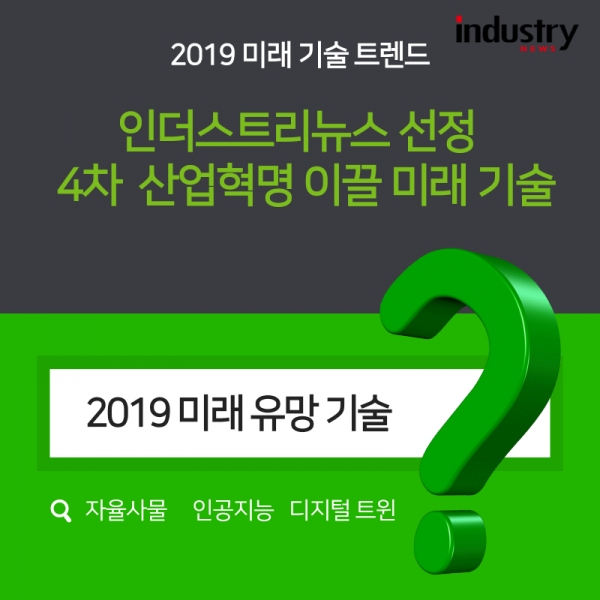[인더스트리뉴스 방제일 기자] 4차 산업혁명에서 기업들은 최근 새로운 기술 트렌드들을 주목하고 있다. 특히 빅데이터, IoT, 인공지능 등은 향후 제조 산업의 미래를 결정지을 것으로 기대되고 있다. 이에 인더스트리뉴스에서 2019년 미래 유망 기술 ‘TOP 5’를 선정했다.