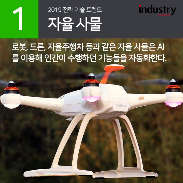 로봇, 드론, 자율차 등과 같은 자율 사물은 AI를 이용해 인간이 수행하던 기능들을 자동화한다.