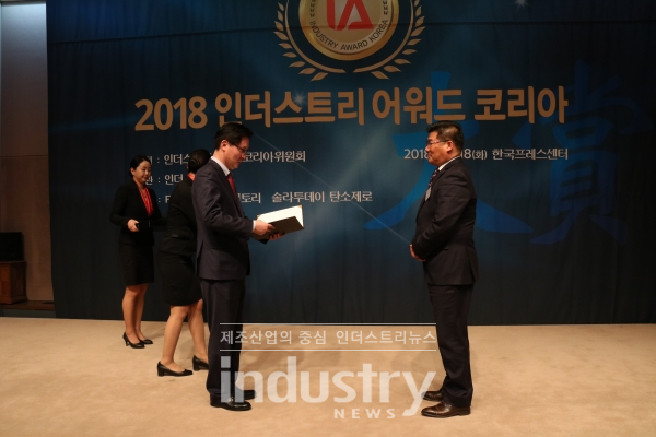 [인더스트리뉴스 방제일 기자] 제조산업 관련 기술개발과 제품개발에 새로운 가치를 창출한 기업을 발굴해 시상하는 ‘2018 인더스트리어워드코리아 대상’이 18일 한국프레스센터 국제회의장에서 개최됐다.