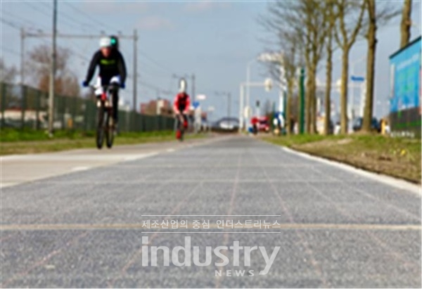 [인더스트리뉴스 정형우 기자] 세계 첫 태양광 도로는 2009년 네덜란드 암스테르담 북쪽 크롬메(Krommenie)에 설치된 100m 자전거 도로다. 이후 네덜란드는 2015년 태양광 도로 70km 구간을 시범 설치ㆍ운행하고 있다. 이 시범도로는 2.5×3.5m 크기의 콘크리트 모듈과 강화유리로 덮인 조립식 태양광 패널로 이뤄져 있으며, 유리 덮개 표면은 사고방지를 위해 미끄럼 방지 처리가 돼있다.