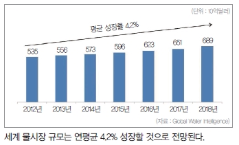 사실 국내 수처리 시장은 현재 상하수도 보급률 98% 수준으로 포화 상태에이른 데 반해 국외 시장은 중동을 중심으로 한 해수담수화 사업, 아시아 지역 상하수도 증설 및 처리장구축 프로젝트 등으로 해마다 가파른 성장세를 보이고 있으며 올해 시장 규모는 약 5,960억달러(한화 645조원)에 달할것으로 전망된다.