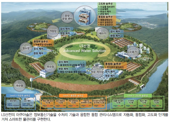 아쿠아솔은 LS산전이 보유한 글로벌 수준의DCS(Distribute Control System), PLC(Programmable Logic Controller) 등 자동화기기(Device)를 기반으로 한 정보통신기술(ICT)을기존 수처리 기술과 융합한 통합 관리시스템으로, 상수부터 하수, 폐수에이르는 물의 일생 전반을 최적의 상태로 관리·운영하는 스마트 물 관리 토털 솔루션으로, LS산전은 물 관리 스마트화를 자동화, 통합화, 고도화 3단계로 규정해 수처리 기술을 개발해왔다.