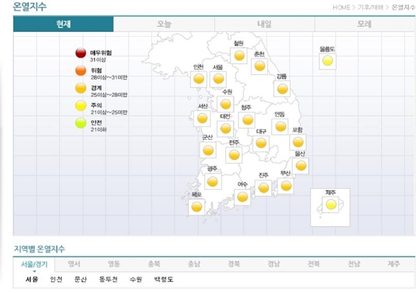 케이웨더 예보센터는 자체 개발한 온열지수 알고리즘에 독자 기상예보 값을 더해 전국 32개 지점의 온열지수 실황과 3일 간(3시간 간격)의 온열지수 예보를 5단계로 구분해 제공 중이며 각 단계별 행동요령도 알려준다.
