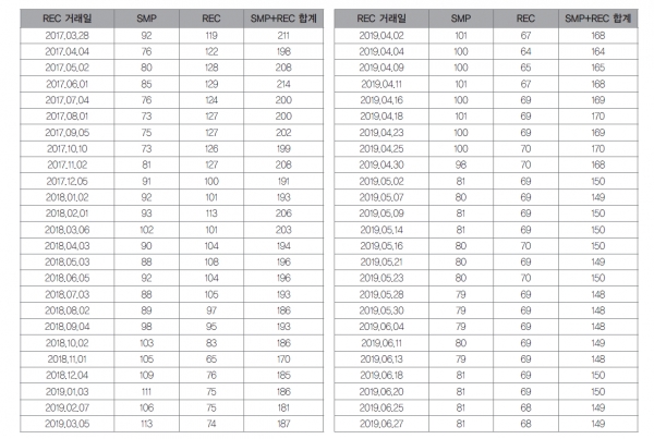 표 1은 SMP+REC 고정가격 경쟁입찰이 시작되었던 2017년 1월부터 현재까지 REC 가격과 SMP 가격, 그리고 REC+SMP 합계 가격을 나타낸 것이다. 초기에는 매월 첫 번째 REC 거래일 상황을 나타냈고, 말미에는 매 거래일마다의 상황을 나타냈으며, REC당 7만원대 형성이 뚜렷함을 알 수 있다.