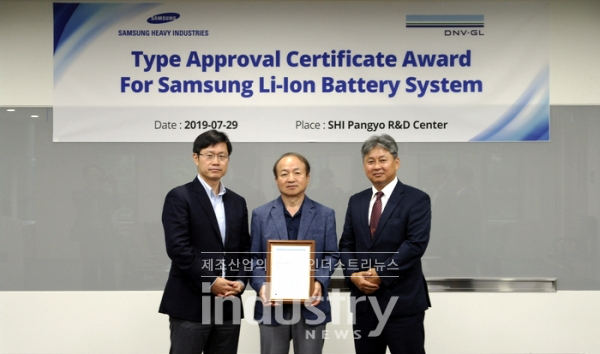 삼성중공업(대표 남준우)은 7월 29일 삼성SDI(대표 전영현)와 선박용 리튬이온 배터리 시스템의 국산화에 성공하고, 국내 업계 최초로 노르웨이 선급인 DNV-GL로부터 형식승인을 획득했다고 밝혔다.