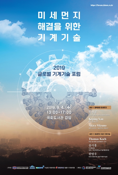 한국기계연구원(이하 기계연)은 9월 4일 국회도서관 강당에서 ‘2019 글로벌 기계기술 포럼(2019 Global Forum on Mechanical Engineering)’을 개최한다. '미세먼지 해결을 위한 기계기술'을 주제로 열리는 2019 글로벌 기계기술 포럼은 기계연과 국회 더불어민주당 이상민 의원, 자유한국당 정용기 의원이 공동으로 주최한다.