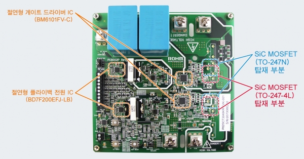 또한, SiC 디바이스의 구동에 최적인 로옴의 게이트 드라이버 IC(BM6101FV-C) 및 각종 전원 IC, 디스크리트 제품을 탑재한 SiC MOSFET 평가 보드 ‘P02SCT3040KR-EVK-001’도 제공함으로써, 디바이스 평가를 간단히 실시할 수 있는 솔루션을 제안하고 있다.