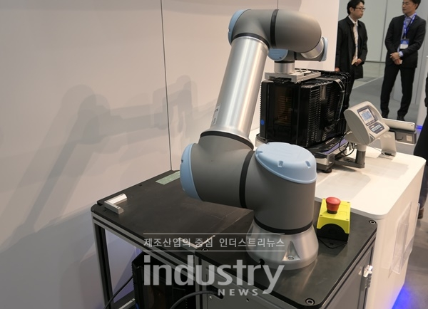 유럽에서도 다양한 협동로봇 기업들이 참가했다. 덴마크의 유니버설로봇(Universal Robot)은 산업 현장에서 실질적으로 쓰일 수 있는 애플리케이션을 소개했다. 특히, 눈길을 끈 애플리케이션은 모바일 로봇과 결합된 UR16e였다. UR16e가 반도체 웨이퍼 카세트를 옮기는 현장인데 주목할 만한 것은 유니버설로봇에서 개발한 OEM DC 배터리를 사용해 파워 케이블 없이 로봇을 운용할 수 있는 점이다.