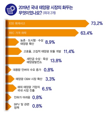 [인더스트리뉴스 정한교 기자] 공격적인 정책 지원 및 투자로 빠르게 성장하던 태양광 산업은 2018년부터 조짐을 보이던 성장통이 2019년에 들어서며 본격적으로 존재감을 드러내기 시작했다. 특히, ‘ESS 화재사고’와 ‘REC 가격 하락’은 국내 태양광 산업에 무시할 수 없는 성장통을 안겨줬다. 설문에 참여한 관계자 중 73.2%가 ‘2019년 국내 태양광 시장의 화두는 무엇이었나요?’란 질문에 ‘ESS 화재사고’를 답했다.