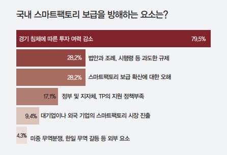 이는 다른 문항에서도 강하게 드러난다. 국내 전문가들은 지난해 스마트팩토리 보급을 방해하는 가장 큰 요소로 경기 침체에 따른 투자 여력 감소(중복 최대 2개)를 꼽았다. 무려 79.5%다.