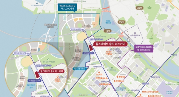 힐스테이트 송도 더스카이는 지하 5층~지상 최고 59층 6개동(오피스텔 1개동 포함), 아파트 전용면적 84~175㎡ 1,205세대, 주거용 오피스텔 전용면적 59㎡ 320실 등 총 1,525세대 규모로 이뤄진다. 지하 1층~지상 3층에는 연면적 2만 5,775㎡ 규모(158실)의 단지내 상업시설 ‘스카이 에비뉴’가 조성된다.