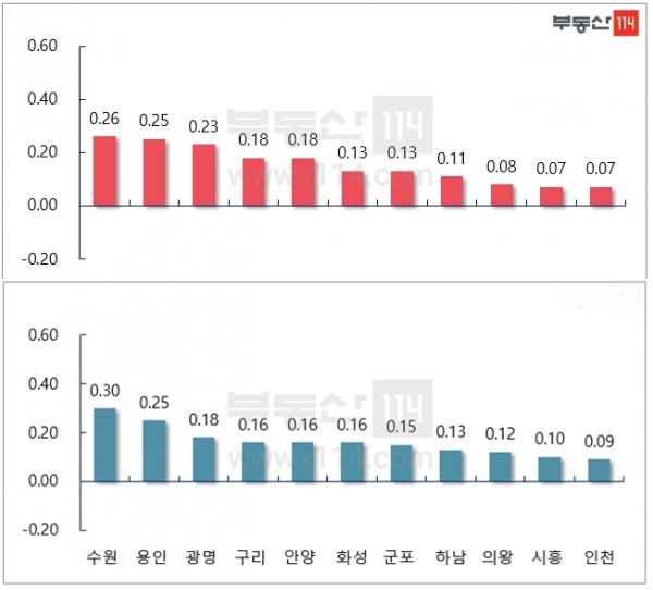 경기·인천은 △수원(0.30%) △용인(0.25%) △광명(0.18%) △구리(0.16%) △안양(0.16%) △화성(0.16%) △군포(0.15%) 등이 가격 상승을 주도했다.