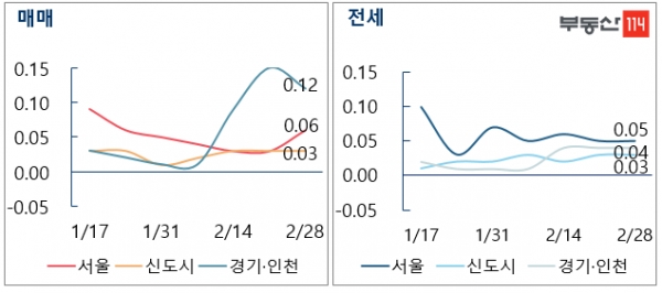 부동산114에 따르면 금주 서울 아파트 매매가격 변동률은 지난주 대비 0.03%p 커진 0.06%로 집계됐다. 재건축 아파트는 0.01%, 일반 아파트는 0.07% 올랐다. 이밖에 신도시와 경기·인천은 각각 0.03%, 0.12% 상승했다.