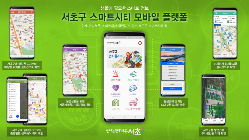 ‘서초 스마트 시티’는 사용자들에게 사물인터넷(IoT), 블루투스 비콘(근거리 무선통신 기술) 센서를 기반으로 △미세먼지, 온·습도 등 생활 환경정보 △CCTV 및 비상벨 위치 △AED(자동제세동기) 위치 등 방범·편의시설 관련 다양한 정보를 제공하는 앱이다.