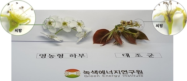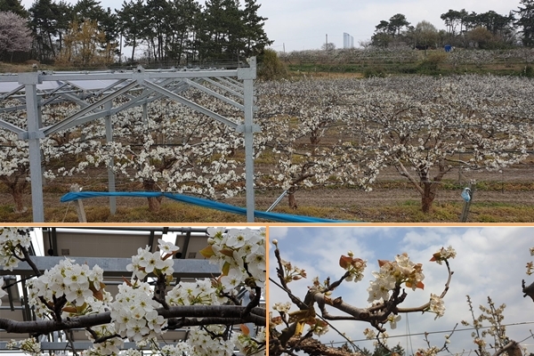 사진2. 2020년 4월 일반 배꽃 개화 모습(대조군, 사진 하단 오른쪽) [사진=녹색에너지연구원]