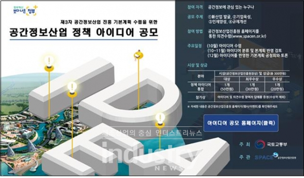 [인더스트리뉴스 최종윤 기자] 국토교통부(장관 김현미)가 올해말 수립할 예정인 ‘제3차 공간정보산업 진흥 기본계획’에 담을 정책 아이디어를 10월 31일까지 공모한다.