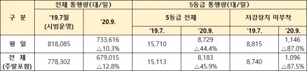 우선 2019년 12월 운행제한 시행에 따라 통행량 감소, 온실가스 배출량 감축의 가시적 효과가 나타났다. 2019년 7월 대비 전체 통행량은 12.8%, 5등급 통행량은 45.9% 감소했고, 통행량 감소에 따른 미세먼지 등 대기오염 물질 감소 효과로는 매년 PM2.5 약 2t 가량이 감소될 것으로 예측하고 있다.