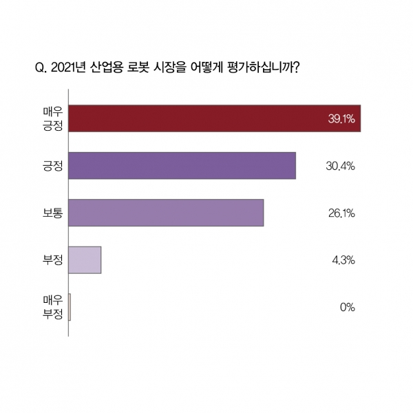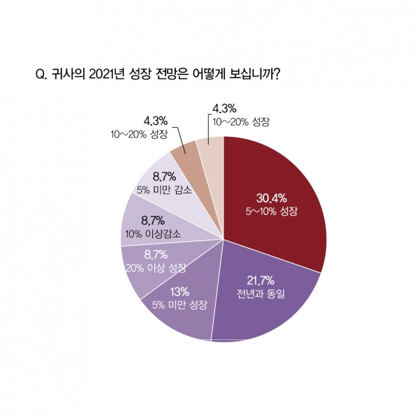 2021년 시장 전망에는 기대감을 드러냈다. 업계 관계자 69.5%가 긍정적 전망을 했다. 부정적 전망은 4.3%에 불과했다. 구체적으로 회사의 성장 전망을 묻는 질문에는 ‘34.7%’가 “비슷하거나 감소할 것”으로 예상했고, “성장할 것”에 65.3%가 몰렸다. 세부적으로 5~10% 성장에 가장 많은 ‘30.4%’가. 10%~20% 성장에 ‘4.3%’, 20% 이상 성장을 예상한 참가자도 ‘8.7%’로 집계됐다.
