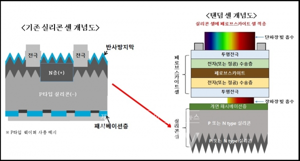 탠덤 셀은 기존의 실리콘 태양광 셀 위에 차세대 태양광 소재인 페로브스카이트를 쌓는 형태로 만든다. 상부에 자리한 페로브스카이트 부분에서 단파장 빛을 흡수하고, 하부의 실리콘 태양광 셀에서 장파장 빛을 추가로 흡수하기 때문에 장파장 위주로 흡수하던 기존 실리콘 태양광 셀 대비 높은 효율을 얻을 수 있다.