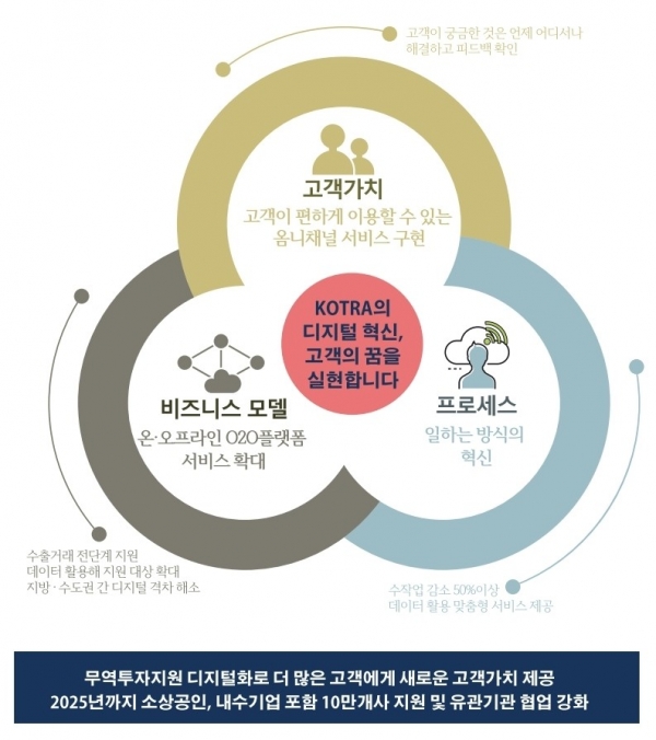 데이터에 기반한 디지털 무역투자 생태계 기반 구축에도 나선다. 빅데이터 플랫폼을 활용해 품목별 수출유망국 및 바이어 추천은 물론 시장별로도 유망품목과 수출에 필요한 최적서비스를 추천한다. KOTRA는 빅데이터 플랫폼, 바이코리아 플랫폼 등을 기반으로 2025년까지 소상공인을 포함한 디지털 고객 10만개사에게 서비스를 제공할 예정이다.