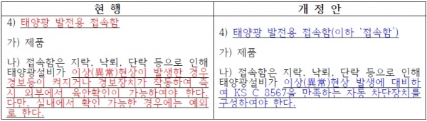개정안에 따르면, 인버터와 관련해 개정되는 내용은 ‘접속함’이다. 기존에는 ‘이상이 발생한 경우, 경보등이 켜지거나 경보장치가 작동해 즉시 외부에서 육안확인이 가능해야 한다’고 표기돼 있다.