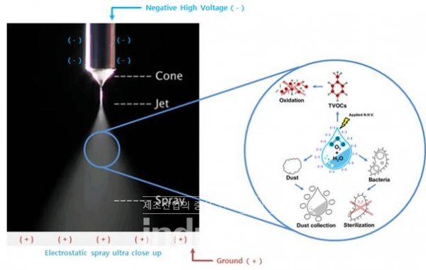 일반적으로 주사기 바늘에 물을 천천히 흐르게 하면 물방울은 표면장력에 의해 방울 방울 떨어지게 된다. 하지만 물이 흐르는 바늘에 고전압을 인가해주면 물 분자 사이의 전기적 척력에 의해 바늘 끝에서 높은 하전을 띈 수백만 개 이상의 작은 물 액적들이 서로 밀어내며 분사된다. 이를 정전분무라 하며, 실내 공기질을 관리하는데 있어 다양한 효과를 볼 수 있다.