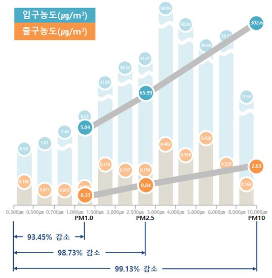 이러한 프로세스를 거쳐 지하철 플랫폼 내에서 3-in-1 정전분무 공기청정기의 성능을 알아본 결과, PM2.5에 해당하는 초미세먼지는 최대 98%까지 제거할 수 있었으며, 30 CMM(m3/min) 규모 처리 능력이 있는 정전분무 공기청정기 2대를 연속 가동했을 때 역사의 플랫폼 공간 중 약 80평에 해당하는 면적의 미세먼지 농도를 최대 40%까지 감소시킬 수 있었다.