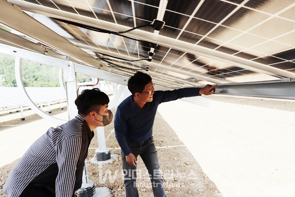 ![최근 시공을 완료한 양면모듈 태양광발전소에서은동환 대표(가운데)와 대양 김백호 대표(오른쪽)가 발전소에 대한 설명을 진행했다. [사진=인더스트리뉴스]](https://cdn.industrynews.co.kr/news/photo/202106/42536_41362_419.jpg)