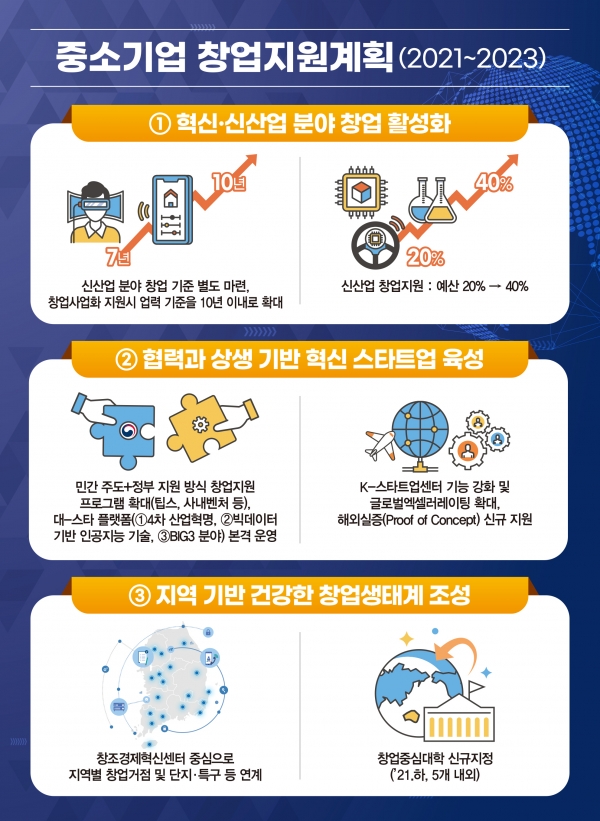 [인더스트리뉴스 최종윤 기자] 중소벤처기업부(장관 권칠승, 이하 중기부)는 8월 3일 ‘중소기업정책심의회’에서 향후 3년간 우리나라 창업정책 방향과 전략을 담은 ‘중소기업 창업지원계획(2021~2023)’을 심의‧확정했다고 밝혔다.