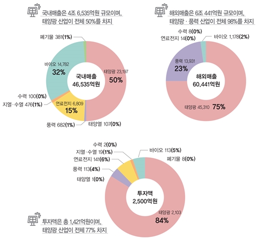 또한, 태양광은 산업 규모 및 매출 규모에서도 높은 비중을 차지하고 있다. 2019년 국내 신재생에너지 매출 규모(4조6,535억원) 중 태양광이 50%를 차지하고 있으며, 해외매출 규모(6조441억원) 중 태양광이 75%를 차지하고 있다.
