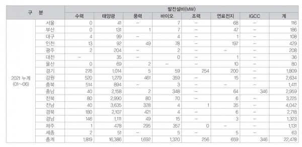 한국전력공사가 발표한 올해 상반기(2021년 1월~6월) ‘행정구역별 신재생에너지발전 설비 및 발전량’ 통계를 살펴보면, △경기(1,809MW) △강원(2,634MW) △충북(1,411MW) △충남(2,959MW) △전북(3,225MW) △전남(4,042MW) △경북(2,718MW) △경남(1,323MW)에 신재생에너지발전 설비가 설치된 것을 알 수 있다.