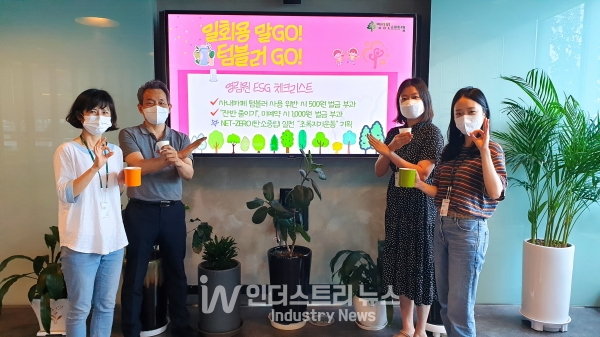 사내카페에서 다회용기 미 사용시 벌금 부과를 통한 일회용품 줄이기, 사내식당 예약 미준수 시 벌금 부과로 잔반 줄이기 활동을 통해 친환경 활동을 실천함과 동시에 이렇게 모아진 벌금은 연말에 필요한 이웃에게 기부하고 있다.