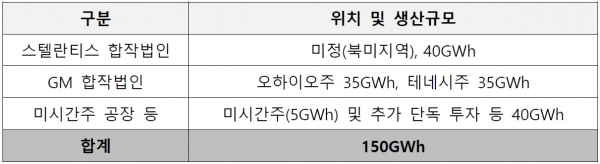 합작공장 부지는 북미 지역에서 유력 후보지를 두고 최종 검토 중으로, 내년 2분기 착공해 2024년 1분기 생산을 목표로 하고 있다. 합작법인에서 생산되는 배터리는 스텔란티스 미국, 캐나다, 멕시코 공장에 공급돼 스텔란티스 산하 브랜드의 차세대 전기차에 탑재될 예정이다.