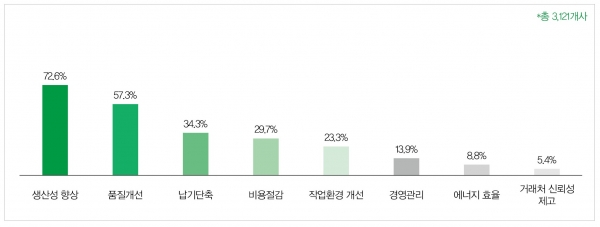 스마트 공장 추진 현황은 뿌리산업의 스마트공장 도입 및 확산이 필요하다고 생각하는 사업체는 8.4%뿐이다. 또한 스마트공장 도입 및 확장 의향이 있는 사업체는 전체 사업체 중 6.8%에 불과하다. 스마트공장 추진의 주된 목적은 생산성 향상(72.6%), 품질개선(57.3%)이며 납기 단축, 비용 절감 등의 순으로 나타난다.