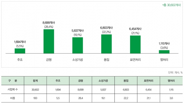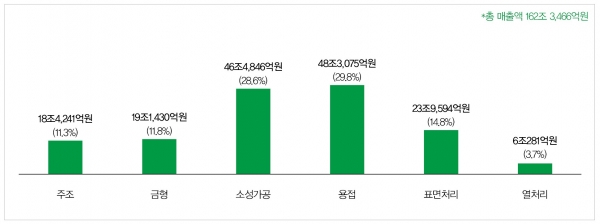 수출액은 23조 8,090억원으로, 소성가공이 30.6%로 가장 높은 비중을 차지하고 있으며 용접, 주조 순이다. 총 제조원가는 130조 1,549억원이며, 업체당 평균은 42억원으로 생산액 대비 비중은 91.2%, 매출액 대비 비중은 80.2%로 나타난다. R&D 투자비는 총 1조 9,034억원이며, 매출액 대비 R&D 비중은 1.2%로 나타난다. 영업이익은 총 7조 1,149억원이며, 영업이익률은 4.4%로 나타난다.