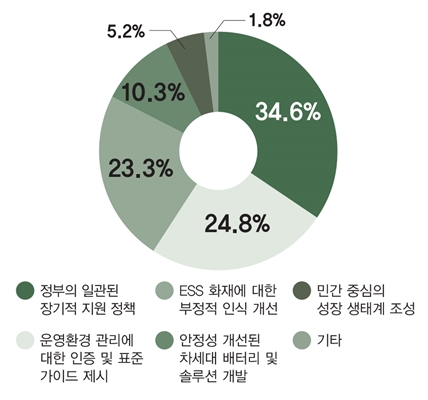 이어 24.8%가 ‘운영환경 관리에 대한 인증 및 표준 가이드 제시’를, 23.3%의 업계 관계자들이 ‘ESS 화재에 대한 부정적인 인식 개선’이 필요하다는 의견을 밝혔다.