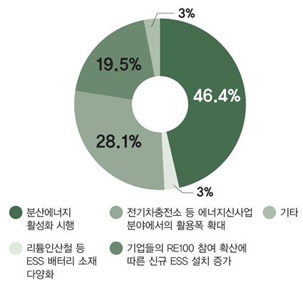시장조사에 참여한 업계 관계자는 “국내 ESS 시장 활성화를 위해서는 신재생에너지의 효율적 사용에 대한 정부의 부족한 인식 및 의지가 개선돼 한다”며, “최근 정부가 청정에너지 전환을 가속화하기 위해 에너지 다소비 사업자를 대상으로 분산에너지 설치를 의무화하겠다는 의지를 밝힌 만큼, 올해 국내 ESS 시장은 기대해볼 법하다”고 말했다.