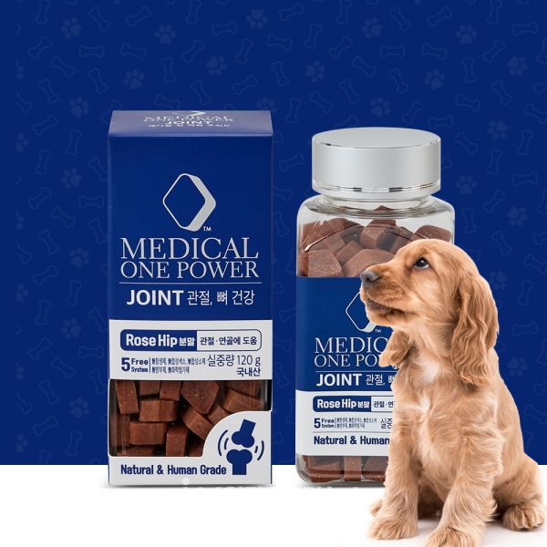 메디컬 원파워 조인트(MEDICAL ONE POWER JOINT)는 반련 동물의 관절과 연골 건강을 위해 국내 최초로 특수 공법으로 제조된 덴마크산 유기농 로즈힙(GOPO)분말을 트릿에 담았다.
