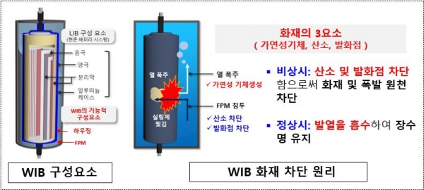 ‘WIB 시스템’은 방화물질을 녹인 용액 속에서 배터리를 작동시키는 개념을 구현했다. 정상 작동 시에는 배터리의 열을 낮춰 수명을 향상시키고, 배터리가 열폭주를 일으키면 표면의 방화물질이 침투해 산소와 열을 차단하면서 화재를 조기 차단하는 원리다.