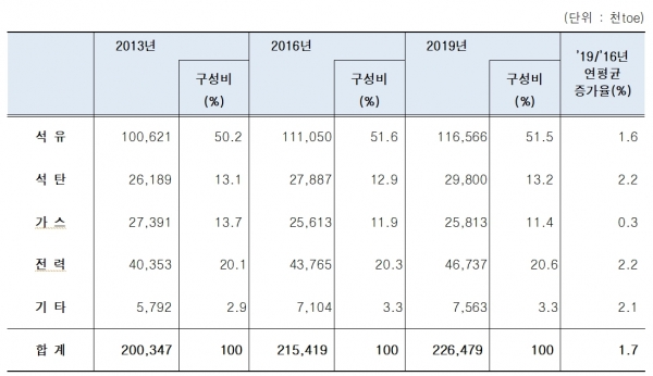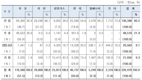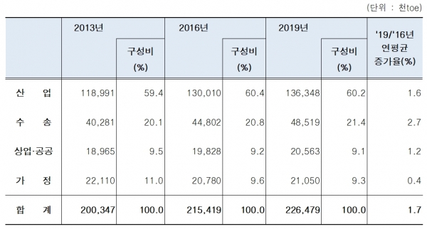 이번 조사는 약 3만5,000개의 부문별 최종소비자 표본을 대상으로, 2019년 한 해 동안의 에너지 소비 현황을 2년간에 걸쳐 조사·분석했다. 조사에 따르면, 2019년 우리나라 수요부문 전체 에너지소비는 2016년 2억1,541만9,000toe 대비 연평균 1.7% 증가해 2억2,647만9,000toe를 기록했다.
