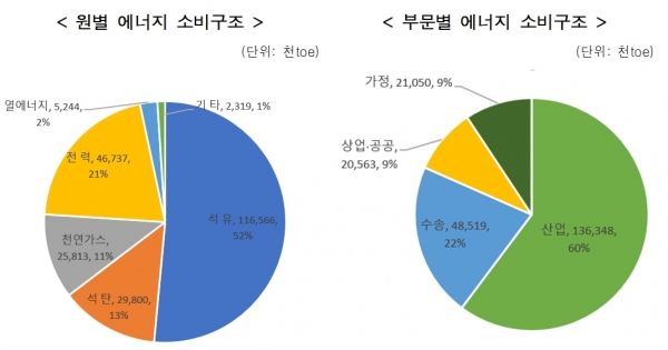 산업 부문의 에너지소비량은 2016~2019년 기간 동안 연평균 1.6% 증가했으며, 전체 최종에너지 소비에서 차지하는 비중은 2016년 60.4%에서 2019년 60.2%로 소폭 하락했다. 산업부문 소비량의 대부분(95.8%)을 차지하는 제조업에서 원료용으로 소비되는 납사 등의 소비 증가로 에너지 소비가 증가한 것으로 파악된다.