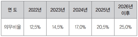 이번 개정안은 탄소중립 실현을 위한 신재생에너지의 발전비중을 확대하고, 신재생공급인증서(REC)의 초과공급 상황 등을 종합적으로 고려하여 연도별 의무비율의 초안을 마련했다. 기존 2022년 이후 10%로 고정되어 있던 의무비율을 올해 2.5%p 상향한 12.5%로 설정하고, 오는 2026년까지 법정상한인 25%에 이르도록 단계적으로 상향하는 안을 마련했다.