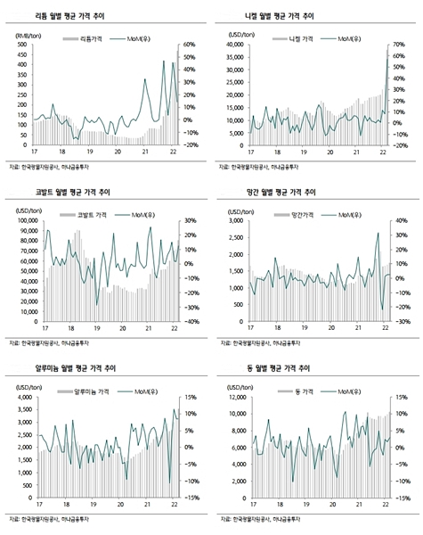 하나금융투자가 11일 발표한 최근 배터리 산업분석 자료 ‘Battery Weekly: 실적 호조와 투자 확대의 콜라보’에 따르면, 주요 광물 가격의 경우, 2월 가격은 전월과 대비해 △리튬 30% △니켈 8% △코발트 2% △망간 2% △구리 2% △알루미늄 9% 상승했으며, 3월은 2월과 대비해 △리튬 14% △니켈 57% △코발트 13% △망간 3% △구리 3% △알루미늄 9% 상승했다.