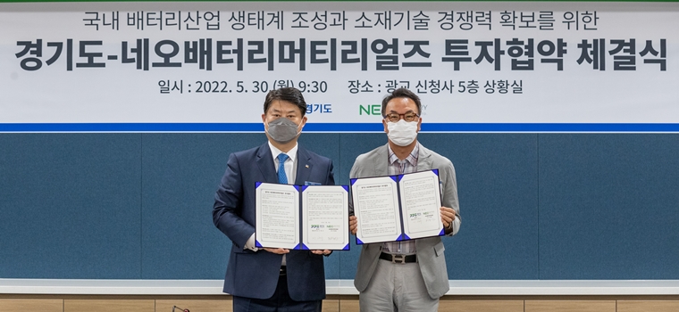 경기도 이한규 행정2부지사와 네오배터리머티리얼즈 허성범 대표(CEO)는 30일 경기도청에서 전기차 배터리 신소재의 양산을 조속히 지원하는 내용의 투자 양해각서를 체결했다.