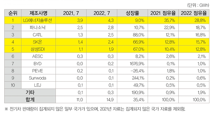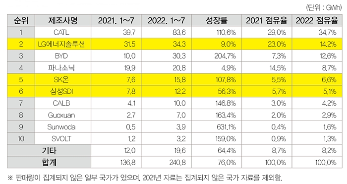 올해 1~7월 판매된 중국 시장을 제외한 글로벌 전기차(EV, PHEV, HEV)에 탑재된 배터리 사용량 순위에서 한국의 LG에너지솔루션이 1위를 지켰고, SK온과 삼성SDI도 각각 4, 5위로 선전하며 상위 5위 내에 안착했다. 이에 따라 국내 3사의 점유율이 55.6%로 상승했다.