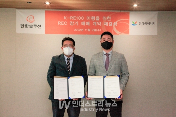 한화솔루션은 2일 한마음에너지와 REC 장기 구매 계약을 체결했다고 밝혔다. 이날 서울 중구 한화빌딩 본사에서 열린 체결식에는 한화솔루션 기후변화대응실 김운회 실장, 한마음에너지 이대영 대표가 참석해 K-RE100 이행을 위한 추가 협력 방안을 논의했다.